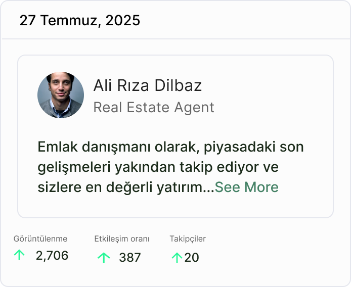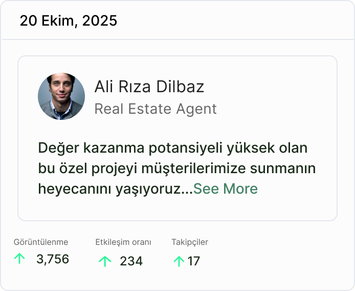 Onlarca mülk, 3 dil, 1 panel. Ekibinin tüm portföyünü tek yerden yönet. Kim ne paylaştı, hangi mülk ilgi gördü, sen sadece sonuçları takip et.